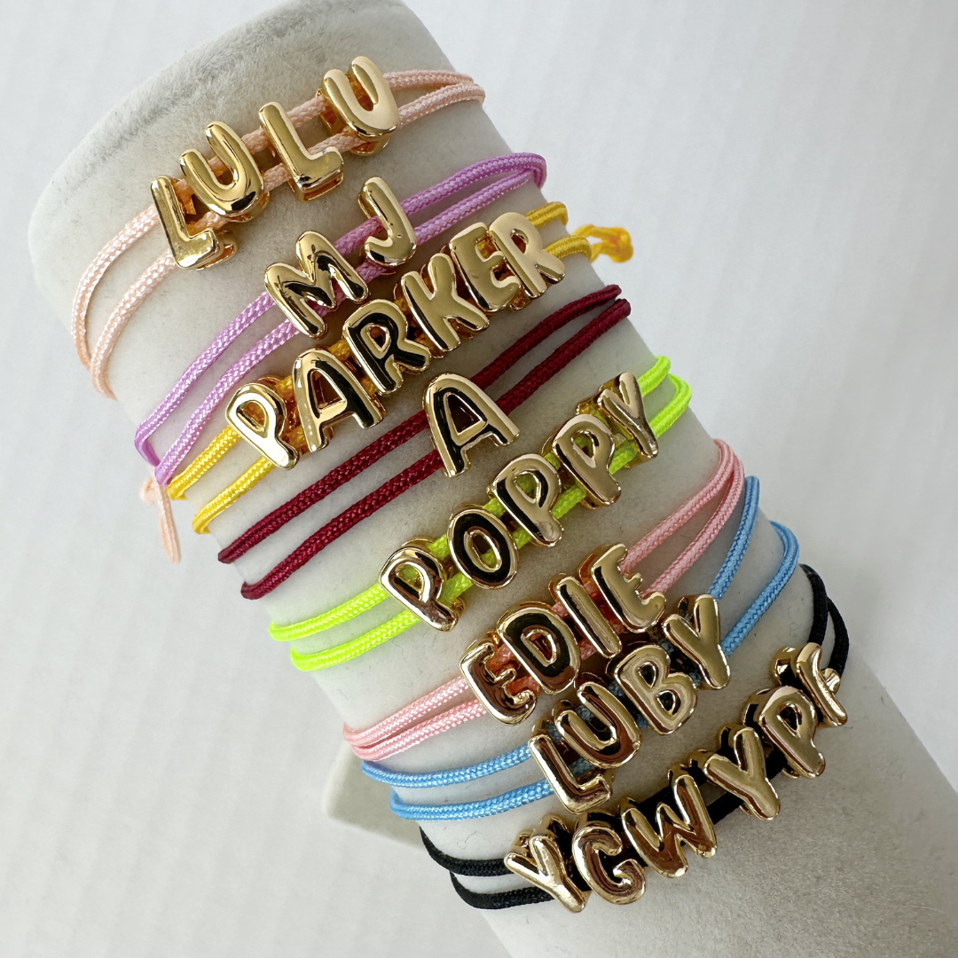 Colorful cord with an easy-to-adjust pull tie. Can accommodate a maximum of 8 letters in lively, playful uppercase bubble font.