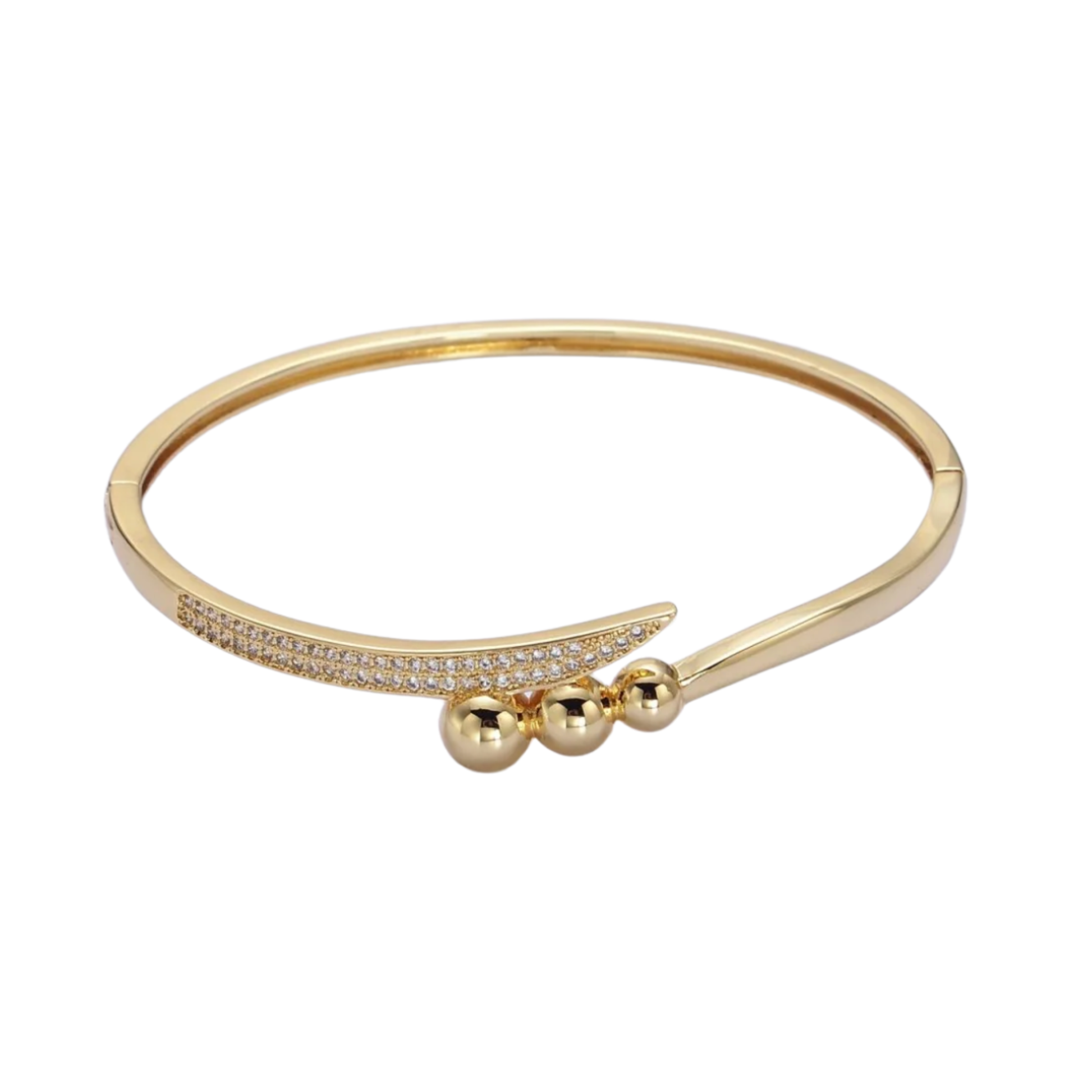 A sleek gold cuff balanced with three beaded spheres and a curve of pavé-set cubic zirconia. Modern, minimal, and made to layer or stand on its own.