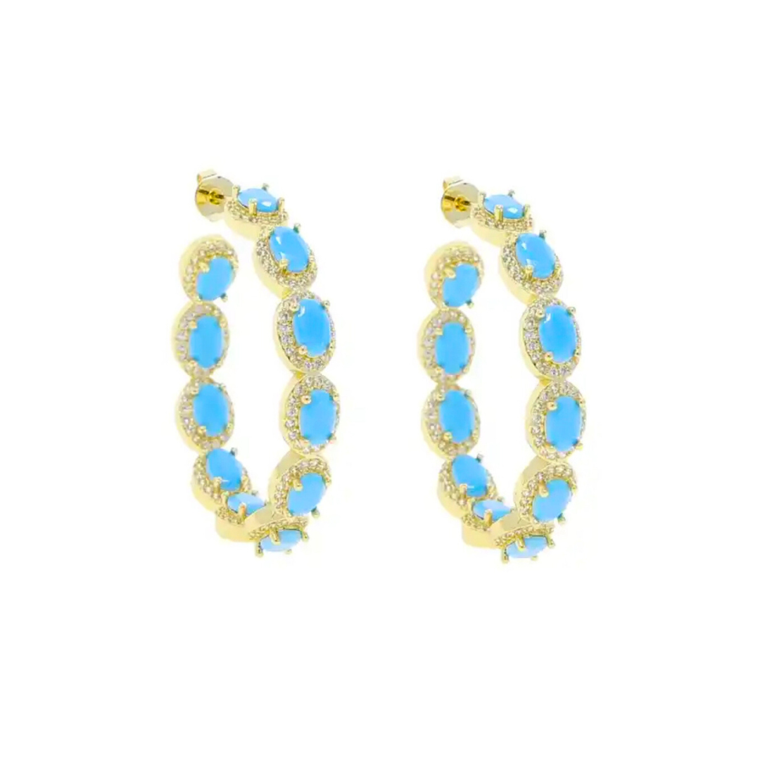 Introducing our Santa Fe Hoops. Featuring a striking turquoise oval design adorned by sparkling cubic zirconia stones. Expertly crafted using the finest materials, these hoops exude opulence and unparalleled quality. Choose between silver or gold, and elevate your summer style.