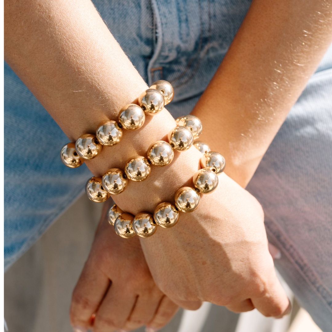 18K Gold filled, 15mm beaded bracelet. Measures 6 inches (stretches to 7 Inch). Tarnish resistant, water friendly.